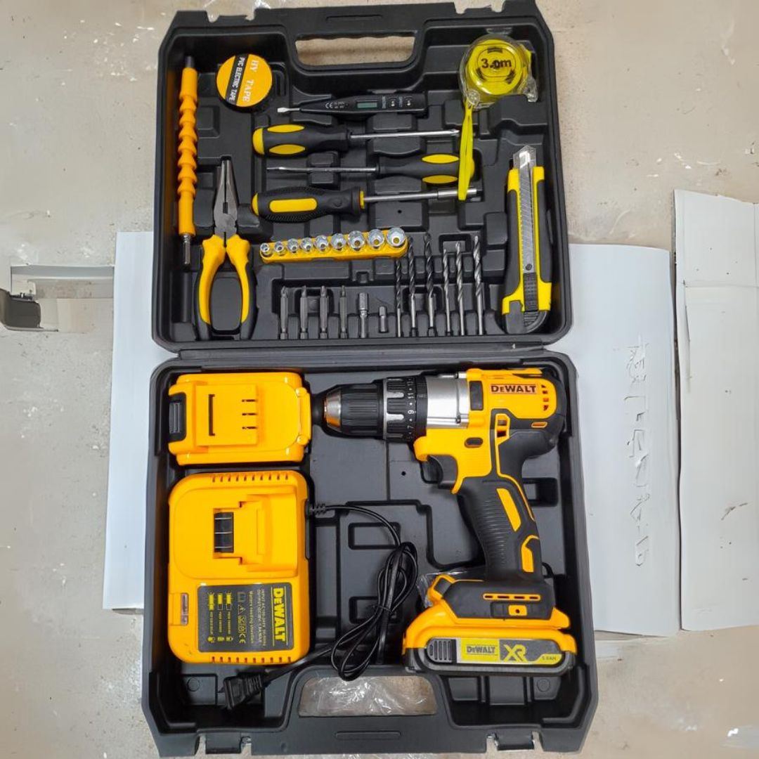 El paquete incluye el taladro inalámbrico, dos baterías potentes, y una variedad de accesorios para diversas aplicaciones de perforación y atornillado.